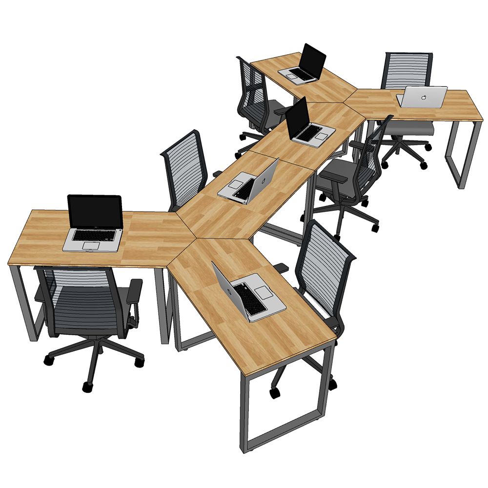Mẫu cụm bàn 8 chỗ ngồi hình chữ thập cũng được sử dụng phổ biến trong văn phòng hiện đại hiện nay. Bàn có thiết kế hình dáng 2 dấu cộng nối liền nhau với phần cạnh bàn vát cong mềm mại tạo điểm nhấn cho không gian.